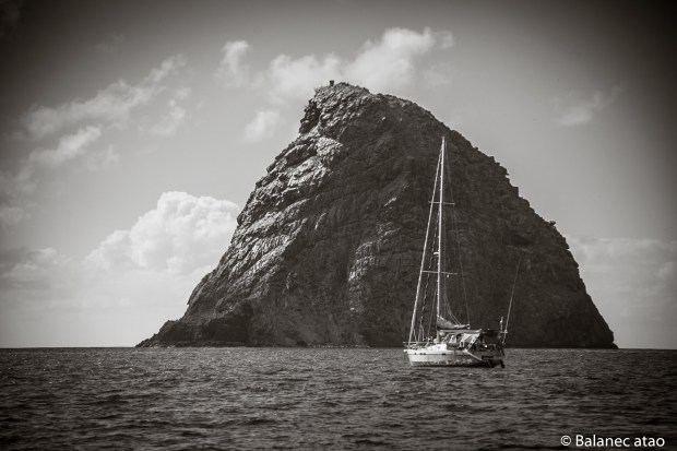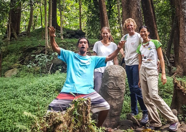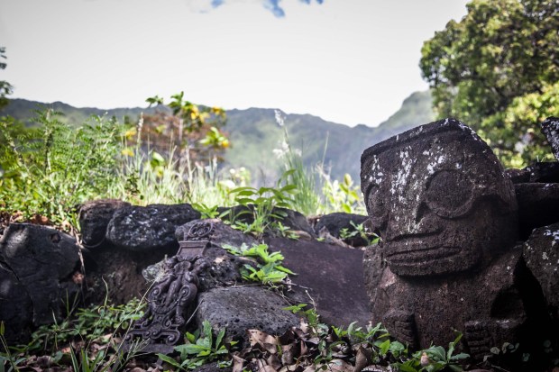 La route qui monte en lacets vers les hauteurs n’est pas avares de vues panoramiques : la baie d’Hatauku où sont mouillés nos voiliers, la ville d’Atuona (1900 habitants) et le mont Temetiu (1260 m) emberlificoté de son habituelle écharpe de nuages. La promenade est tranquille, touristique voire monotone quand Jérémie lance un « Yop ! ». Les chevaux partent au quart de tour dans un galop aérien et, soudain, à croiser des voitures et des pick-up en sens inverse, on trouve la balade sur béton beaucoup moins pépère ! Après 10 mn de palpitations intenses, nous descendons de nos montures pour pénétrer dans un bois ombrageux. Là, près d’une sculpture en pierre représentant un tiki (homme-dieu) fendu d’un large sourire, Jérémie, tout feu tout flamme, nous mime plus qu’il ne nous raconte la légende du cochon, animal tutélaire à Hiva Oa. Comme le cheval et la chèvre, il en existe des centaines vivant librement dans cette nature délivrant fruits, baies, racines et plantes comestibles à foison. Même les poules se dandinent en toute insouciance dans les fougères comme dans les rues d’Atuona, les habitants préférant acheter œufs et cuisses de poulet surgelé au magasin.